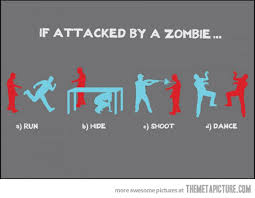 These sections of your post really caught my eye and provoked some thought. Throughout the choose your own adventure books, as well as in the game we played for today "Choice of Zombies", I tried my best to make decisions that I thought I would make in a real zombie scenario. I often found myself wondering how much more difficult some of these choices would be when confronted with the actual possibility of becoming a zombie and if I would be able to act in a timely fashion. While I would like to think I would be the hero, killing lots of zombies and saving lots of lives, I think it is entirely possible that I would be hiding under a table (as depicted in the graphic above) sobbing and paralyzed in fear. It is impossible to tell what a person would do given this farfetched situation, though it is easy to assume one would not make as many brave decisions in reality as they would in simulations such as in "Zombocalypse Now" or "Choice of Zombies".